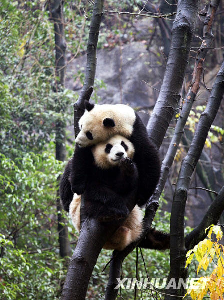 1月2日,憨態可掬的奧運大熊貓“鳳儀”和“美欣”在樹上休息。
