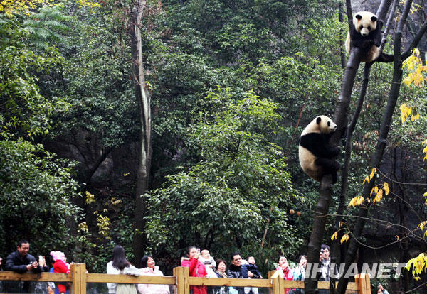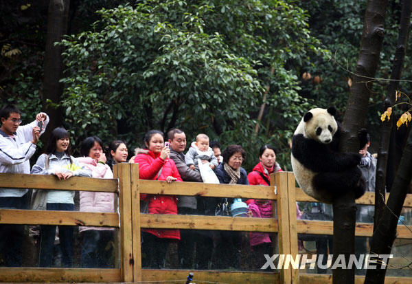 元旦假日,剛剛落戶廣西桂林動物園的奧運大熊貓“鳳儀”、“美欣”正式與游客見面,給人們帶來了新年的歡樂。新華社發(李凱 攝)