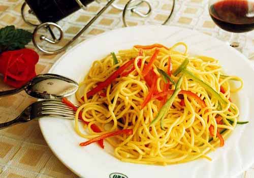 ????細(xì)面條480g,香腸65g,茄子80g,西紅柿65g,柿子椒30g,豆角30g,蔥頭65g,色拉油適量,