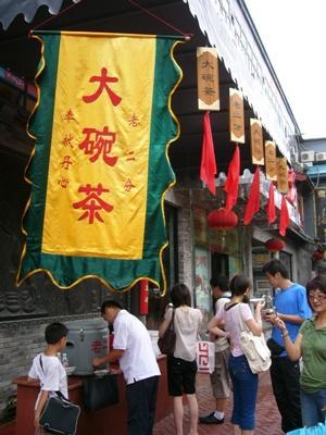 ????記得很多年前,趁著去北京的機會,興沖沖地趕往前門,試一試聞名已久的“前門大碗茶”。地方沒找錯,遠遠可看到在香煙盒上早已熟悉的“大前門”,招牌上有大大的字寫著“前門大碗茶”,遞上1元錢,一個老人從一個大銅壺的細嘴中倒出茶湯到一個大碗中,遞給我。不料,喝了一口茶,卻讓人惘然,這就是著名的“大碗茶”?怎么跟我們稱之為香片的茉莉花茶一樣,只是,更為粗劣。心中充滿了疑問和一種上當的感覺。