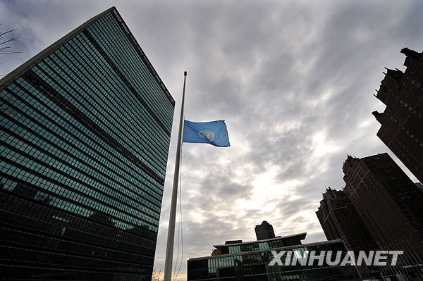 1月13日,美國紐約聯合國總部大樓前的聯合國會旗降半旗向海地地震中遇難者致哀。新華社記者申宏攝