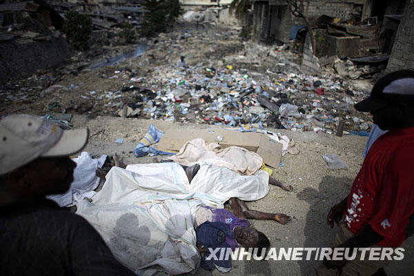 1月13日,在發生地震的海地首都太子港,人們站在遇難者遺體旁。新華社/路透