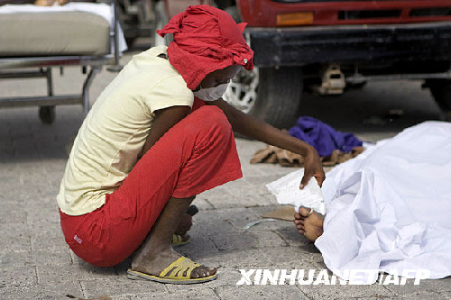 在海地首都太子港,一名女子查看死者遺體上的標簽。