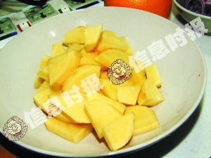 1、洗凈蘿卜與土豆,去皮切成塊狀,洋蔥切成條狀。