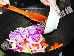 3、熱熔適量黃油,爆香洋蔥,加入胡蘿卜以及土豆翻炒均勻。