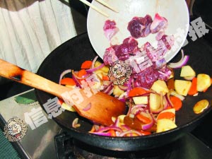 4、加入牛腩,待牛腩翻炒至變色時(shí),并加2杯清水燜煮。