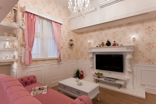 我們家是小復式,空間格局特別簡單,一樓是玄關、客廳、廚房、吧臺、書房、和室、衛生間;二樓是主臥室、兒童房、更衣儲藏室。我們的房子純粹為婚房而裝修,不想要冷硬的色調和直板的現代簡約,就跟設計師討論出一個粉嫩的歐式風格來,設計師把我喜歡的白色的蕾絲、白色鍛造線條、精致的法式線板、粉紅色的沙發,結合這些元素搭構起來,就裝修成了我的浪漫城堡!