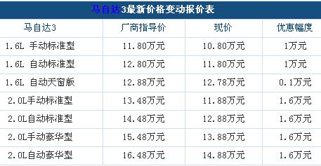 ?? 近日,鳳凰網汽車從北京地區長安馬自達4S店獲悉,目前三廂馬自達3[綜述 圖片 論壇]全系車型有1000元-16000元不等的現金優惠,1.6L車型最低10.80萬元。店內目前現車不多,顏色也不齊全,如現在預訂的話,主流顏色預計1個月左右可以提車。更多優惠可到店資訊。具體價格信息詳見下表: