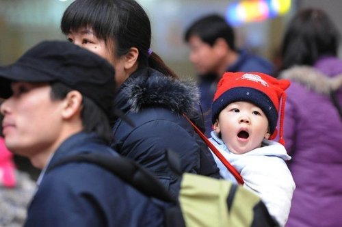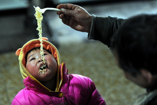 2010年2月3日,濟南火車站:家長喂小孩吃面。攝影:王鋒/CFP