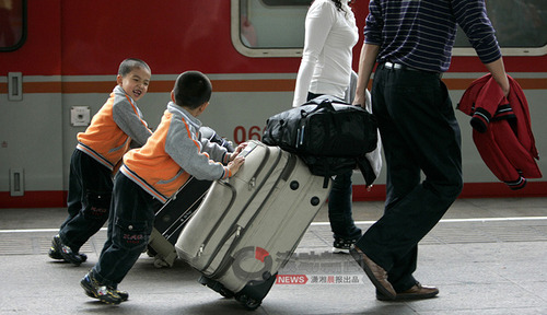 ????春運路上:孩子渴了,喝口礦泉水;餓了,吃口泡面,啃片干面包;困了累了,在父母親的懷里打個盹。進站上車的時刻,如同百米沖刺,已經(jīng)重負在身的父母只能拉著年幼的孩子一路狂奔,瘦小的身影猶如父母手上的一件行李,踉踉蹌蹌地被拖來轉(zhuǎn)去。