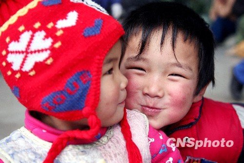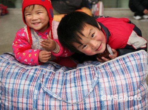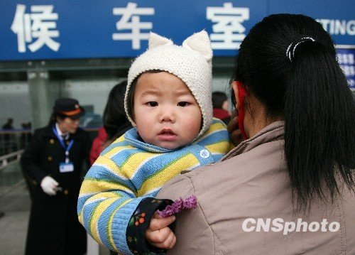 ????1月31日是2010年春運的第二天,在外工作的人們陸續開始返鄉旅程。許多孩子跟隨父母來到火車站等候列車踏上返鄉之路。中新社發 鐘山/攝