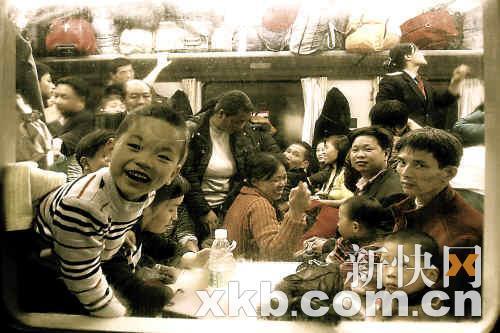 經過一輪沖刺,好不容易擠上火車,一小孩露出笑容。攝影:黎湛均