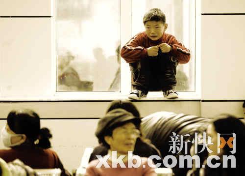 母嬰候車區,一孩子與父母吵架,獨自蹲在窗臺上哭泣。攝影:黎湛均