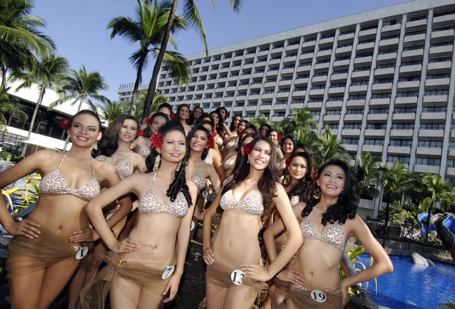 2月18日,在菲律賓首都馬尼拉,參加2010年菲律賓小姐競選的選手們在展示泳裝。當日,共有24名佳麗參加了這項比賽。
