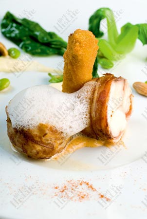 ????鮮嫩的扁沙魚先經過8小時的腌漬,再用肥瘦均勻的豬腹肉薄片包裹起來煎烤,豬肉的油脂補足了魚肉缺少的滑潤。配菜不拘一格地采用青翠的四季豆、鮮嫩的油菜心和毛豆中西合璧,味道的搭配天衣無縫。相對于主料的簡約,醬汁的豐富有點奢華了,濃香的葵花油醬、辛香的蒜蓉醬、清香的白菜花醬、奶香的西班牙香腸,給主料新嫩清香的質感增加了一連串豐富的層次。