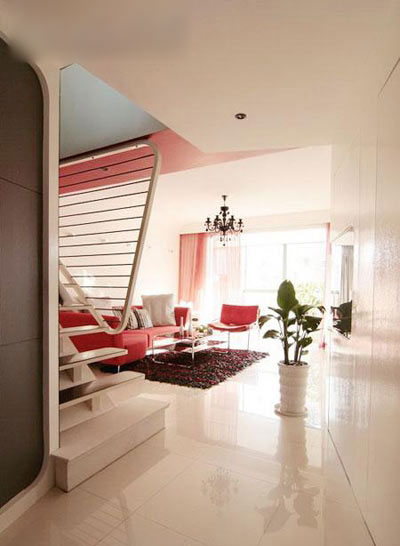 小復式三房,采用紅白色調,總花費20萬的豪華裝修,走進室內,就能被這時尚的裝修所吸引。