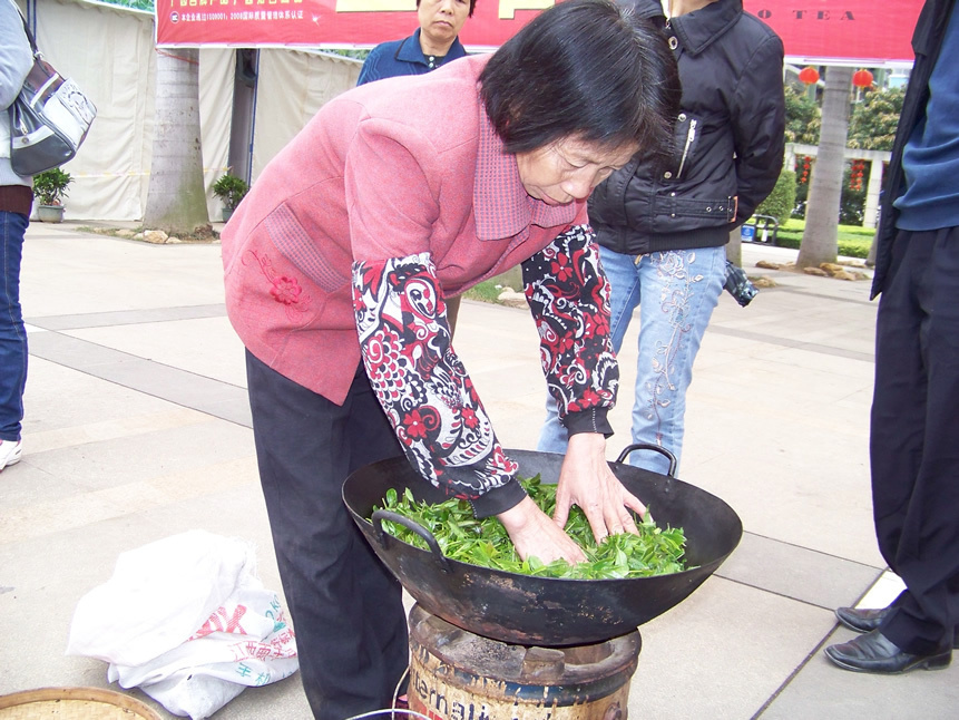 ????梧州零距離訊 (記者 黃祎婧 韋世寧)3月26日上午十點多,六堡茶開幕式完畢后,零距離網友在會場的右側集合,一起體驗炒茶。本次的炒茶活動,是由“六堡昌茶行”全程贊助的,茶行的蔣阿姨從店鋪搬來了兩個爐子、兩個鐵鑊和兩袋茶葉,還有一個木制揉茶機。用來炒的六堡茶葉是今早從六堡采摘出來的,而木制的揉茶機今天一早被東莞市茶文化促進會會長蔡生看中以不明價格買下了,成為他們博物館的最新收藏品,進行完這次炒茶活動后,這臺揉菜機就會跟隨蔡生回東莞了。