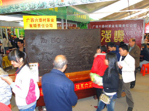 ????而在六堡茶博覽交易會(huì)現(xiàn)場(chǎng),最吸引大眾眼球的莫過(guò)于一塊來(lái)自廣西六堡村茶業(yè)的強(qiáng)壽六堡茶磚。該茶磚是中國(guó)最大的茶磚,同時(shí)也創(chuàng)下了吉尼斯世界記錄。它是由1362斤特制六堡茶壓制而成的,上長(zhǎng)1958毫米,下長(zhǎng)2008毫米,寬1250毫米,厚300毫米,茶磚正面刻著“廣西50大慶紀(jì)念、1958—2008,六堡茶,廣西六堡村茶業(yè)有限責(zé)任公司承制”的字樣。據(jù)該茶磚的制作人李浪輝先生介紹,這塊茶磚是為慶祝廣西壯族自治區(qū)50周年而特別制作的。