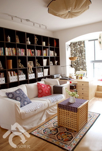 客廳沙發背后,書桌是現場制作,雙層杉木指接板油漆調米色