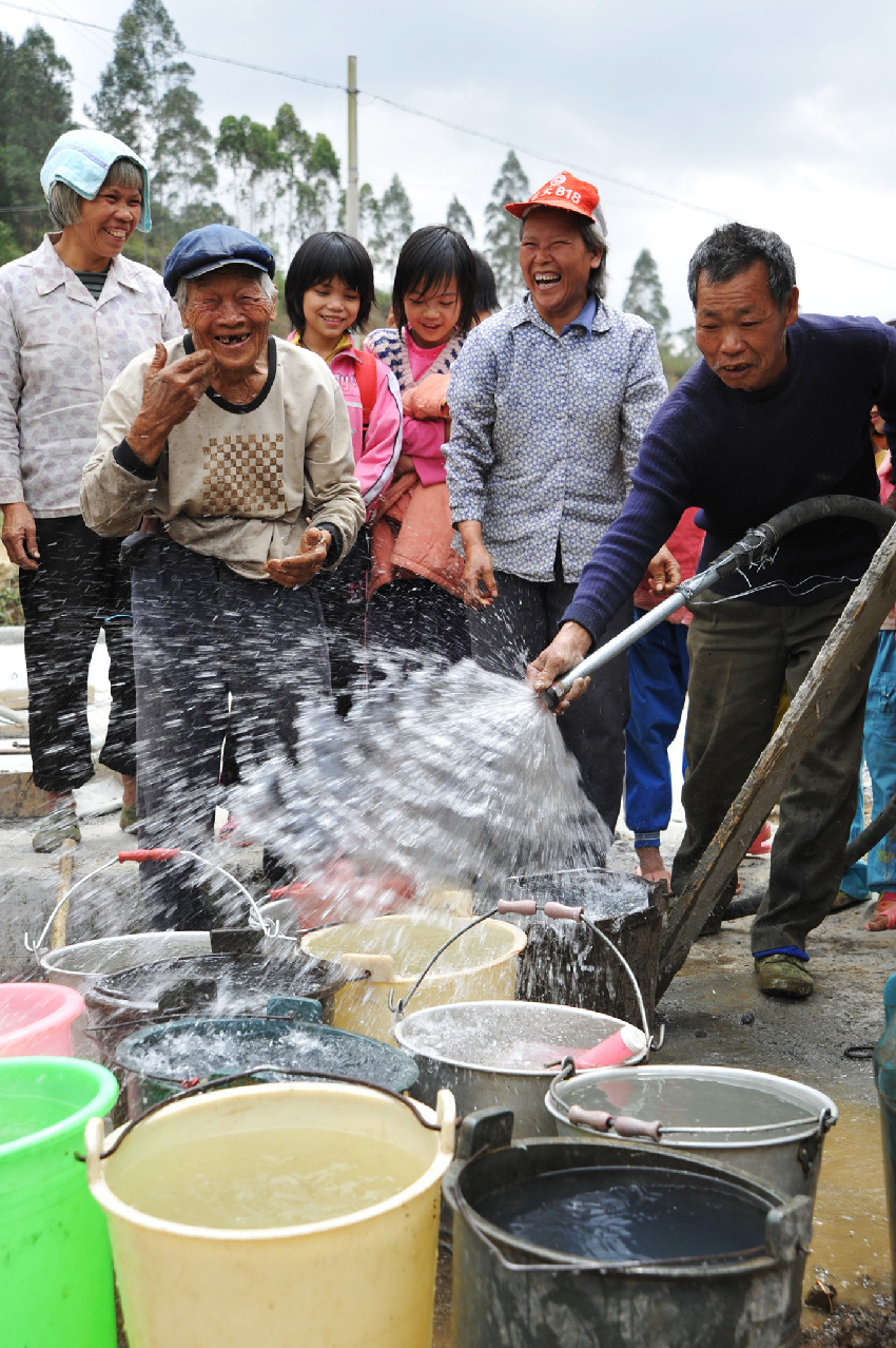 3月30日,廣西百色市靖西縣新甲鄉(xiāng)孟求村群眾開挖的應急水井抽水成功,開始供水,村民們都笑了。 新華社發(fā)(趙京武 攝)