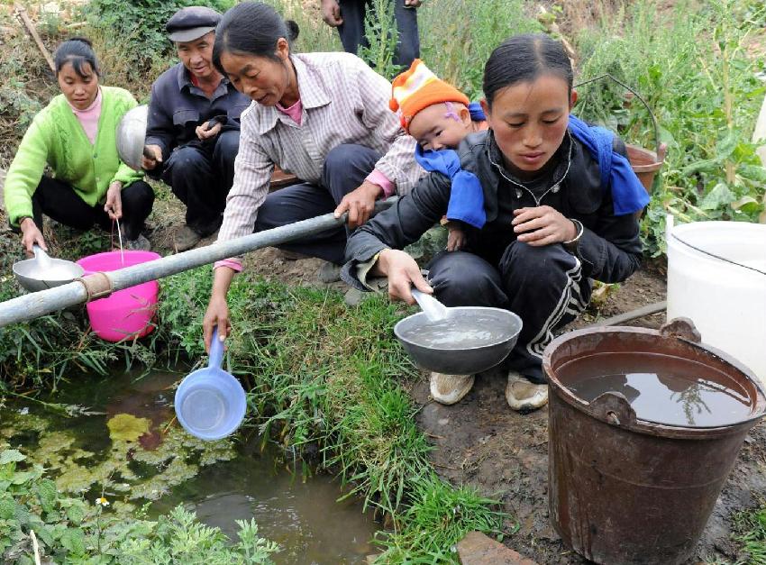 3月28日,石林縣老黑山村的村民在小水潭里取水。