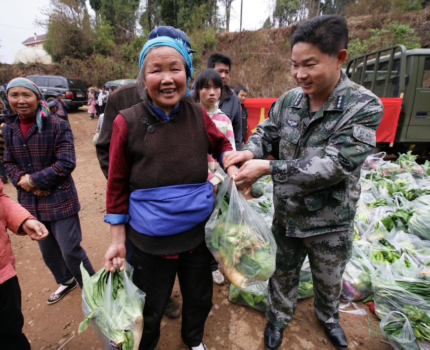 3月28日,空軍駐云南某部官兵為災(zāi)區(qū)群眾分發(fā)蔬菜。