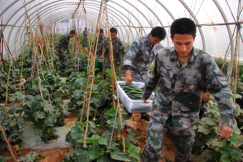 3月28日,空軍駐云南某部官兵在部隊菜園摘菜,準備送往災區。