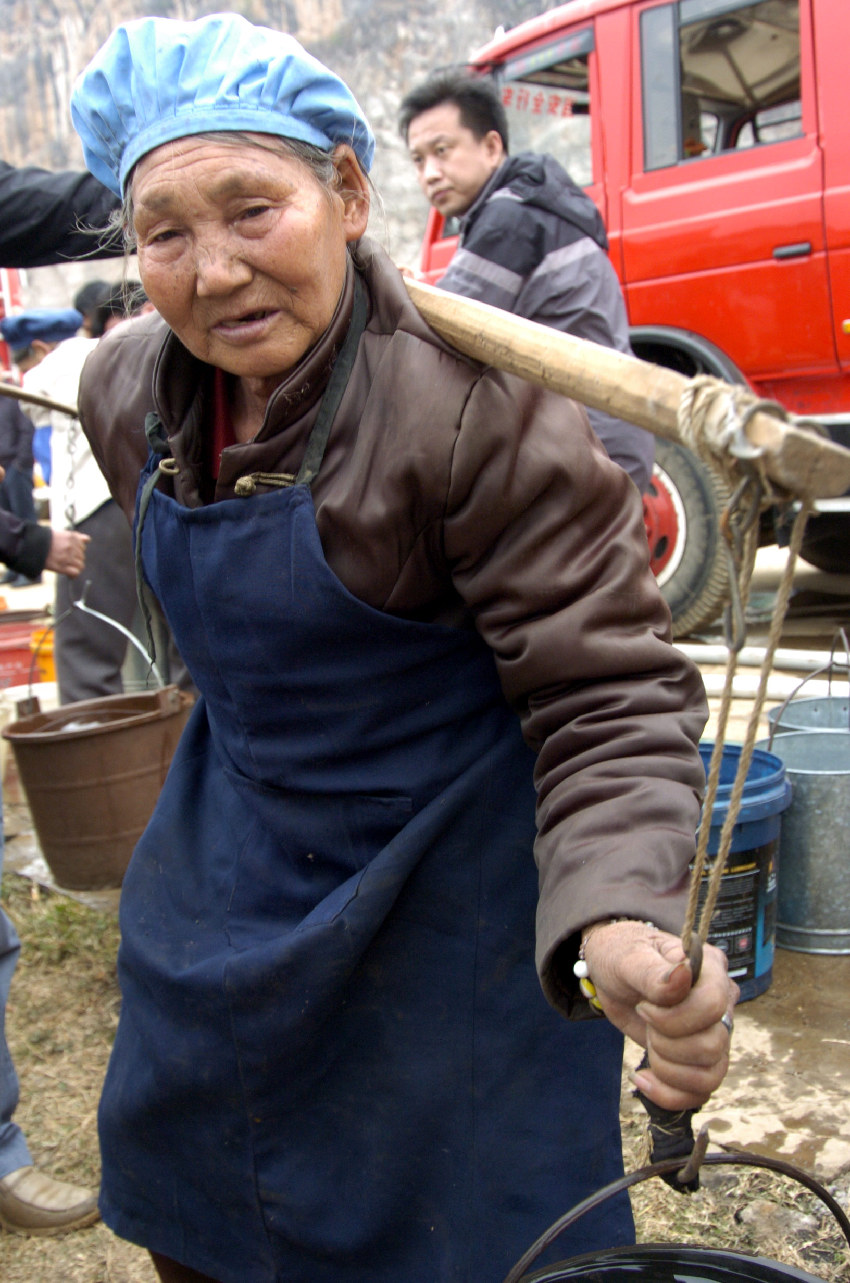 3月28日,貴州盤縣板橋鎮銀貢山村74歲的老人王雪美在往家中挑水。新華社記者 婁辰 攝