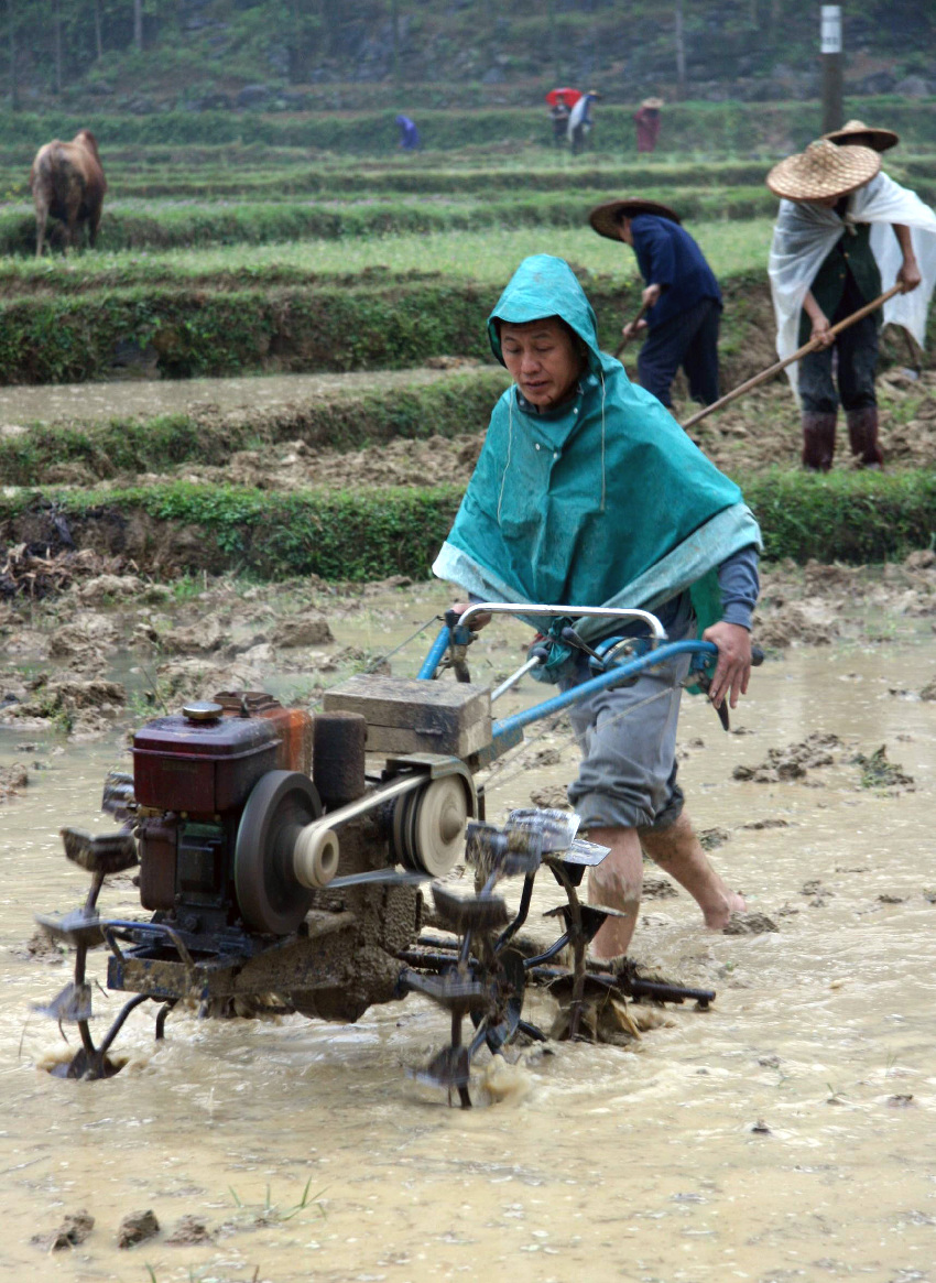 3月30日,廣西羅城縣懷群鎮劍江村農民冒雨耙田,為育秧做準備。新華社發(吳耀榮 攝)