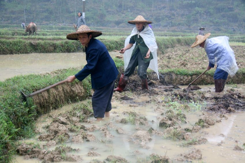 3月30日,廣西羅城縣懷群鎮劍江村農民在田里除草,為耙田育秧做準備。新華社發(吳耀榮 攝)