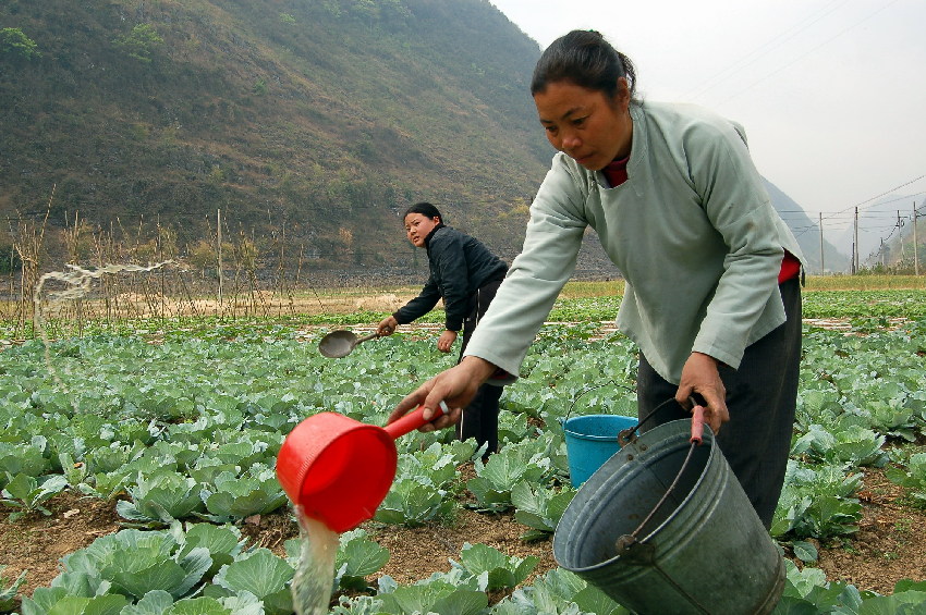 3月30日,廣西樂業(yè)縣同樂鎮(zhèn)武稱村群眾在用井水澆灌久旱的菜地。新華社記者 張周來 攝