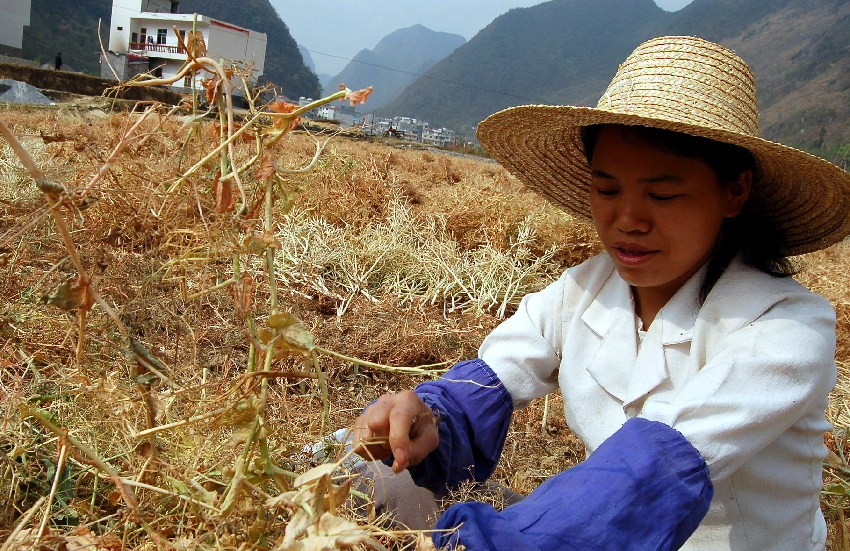 3月30日,廣西樂業縣同樂鎮武稱村一位婦女在油菜地里忙碌,當地油菜籽產量因旱減產一半以上。新華社記者 張周來 攝