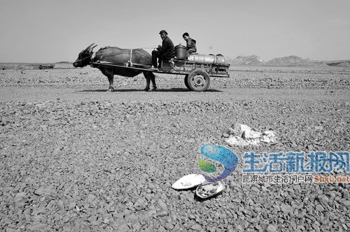 村民經過干枯的陸良德格海子水壩去運水 記者 金林 攝
