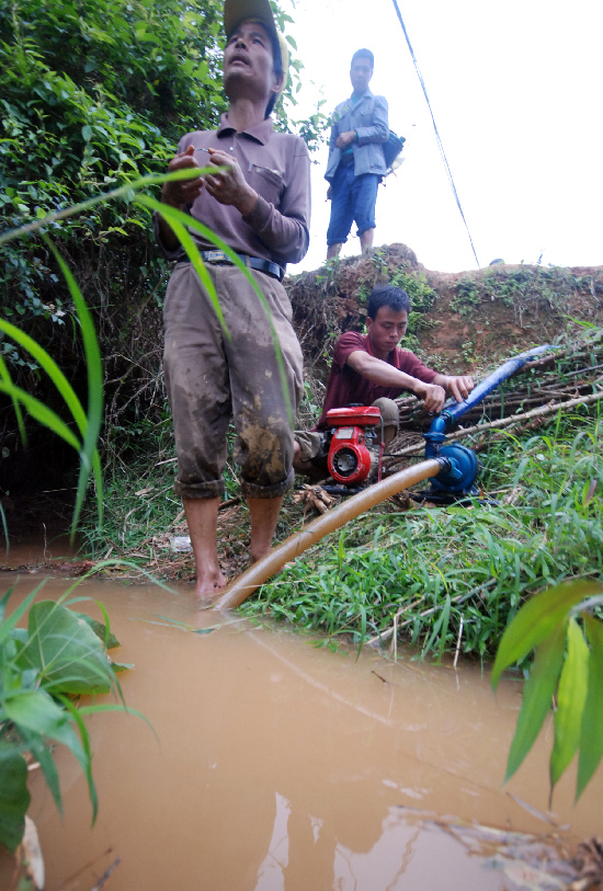 3月30日,蒼梧縣龍圩鎮中村的農戶用小型抽水機在小溪里抽水來進行春耕。