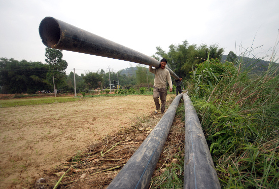 ?? 蒼梧縣水利局派出技術人員到受旱的部分農田區域鋪設較大型的專門輸送管道,從下小河等水源處抽水,保證農戶的春耕用水。蒙紹松/攝