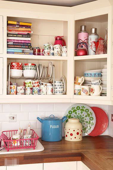 相對于廚房用品以及飾品較為強烈的視覺沖擊,櫥柜的整體顏色卻是非常簡約,甚至臺面的實木也是透著一種原汁原味的純粹,兩種不同風格相互映襯,又相互突出,為可能相對平淡的廚房帶來了一些情趣。