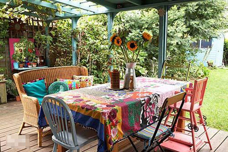 如果放置的桌椅顏色過(guò)于單調(diào),顯然是相當(dāng)不協(xié)調(diào)的搭配,如果僅僅配上綠色,又會(huì)讓整體視覺(jué)相對(duì)平淡。主人顯然意識(shí)到了這點(diǎn),為桌子鋪上了多彩的桌布,由于桌子的位置居中,不會(huì)使得視覺(jué)整體出現(xiàn)失重,卻很好的為大自然的多彩多姿作了注腳。除了桌布外,主人對(duì)椅子的選擇也是多種多樣,但從部分椅子中的破舊質(zhì)感考量,這一選擇并不單單只是屬于顏色的選擇,而是體現(xiàn)了主人注重對(duì)家具二次利用的環(huán)保理念。