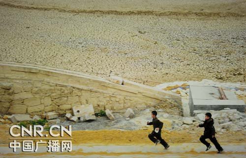 ??? 2010年4月,貴州興義市晏家灣水庫,兩個孩子跑過干涸的水庫。2009年以來,中國黔西南地區遭受特大干旱,水庫于12月徹底干涸,造成下游一萬多畝農田失去了灌溉。