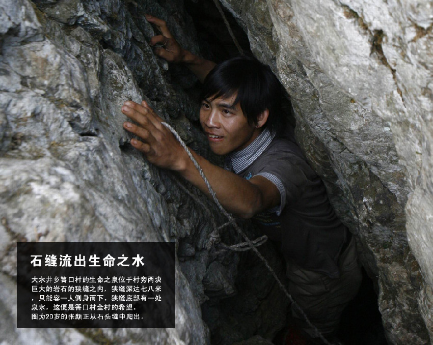大水井鄉(xiāng)箐口村的生命之泉位于村旁兩塊巨大的巖石的狹縫之內,狹縫深達七八米,只能容一人側身而下。狹縫底部有一處泉水,這便是箐口村全村的希望。今年2月,箐口村周圍的山泉開始干涸。村里開始發(fā)動過年回家的60余名年輕人,在亂石林立的山中,到處尋覓。2月底,村民終于發(fā)現(xiàn)了這處藏在巨石間的泉水。由于狹縫較深,每次取水都需兩個村民一起才能完成:村民先將一根十余米長的粗繩甩入洞中,一個村民在洞口拽住繩子,另一個村民沿繩下爬。因為這種特殊的取水方式,當地村民將這眼“石中泉”稱為“吊井”。