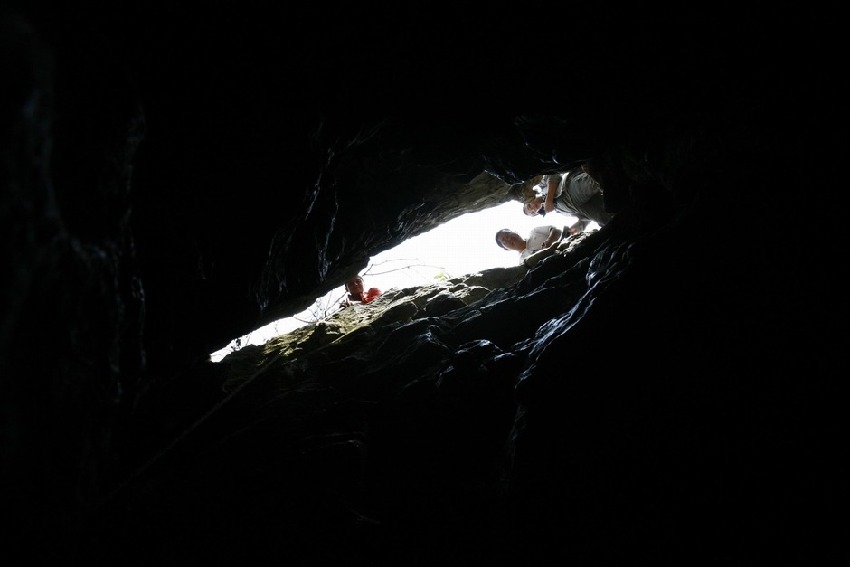 云南省羅平縣大水井鄉箐口村“吊井”,從石頭縫底部向上望,縫隙很狹小。