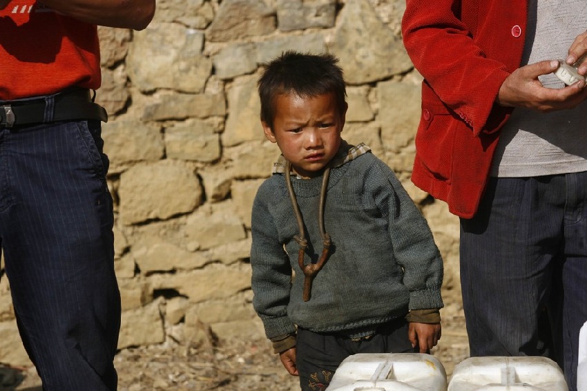 云南省羅平縣大水井鄉唐梨凹村,小孩子正在等待接水。