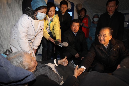 溫家寶一下飛機,就乘車趕往災情最嚴重的玉樹州結古鎮。他冒著余震的危險,爬上碎石滾落的廢墟,查看災情,指導救災工作。在玉樹州民族綜合職業學校,校舍已成廢墟,到處可以看見散落的書本。