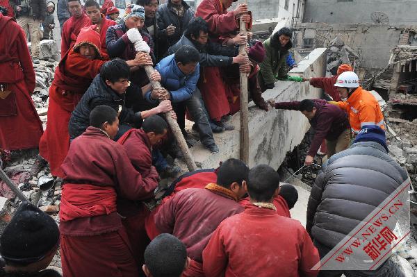 4月16日,在結(jié)古鎮(zhèn)紅衛(wèi)路一倒塌民房處,許多受災(zāi)群眾自發(fā)前來幫助救援人員搜救。新華社記者 李紫恒 攝