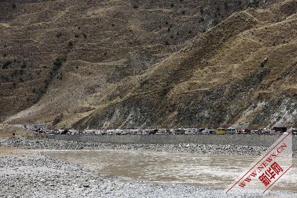 ????4月16日,在接近玉樹的路段發生擁堵,人們等待通行。新華社記者 沈伯韓 攝