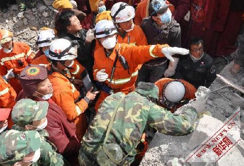4月18日,在青海玉樹地震救援現場,消防隊員用生命探測儀搜救幸存者。連日來,從解放軍、武警部隊、消防官兵到公安民警,從專業救援隊到普通志愿者,從各級領導干部到廣大人民群眾……在玉樹地震災區的廢墟上,大家奮力搜救。營救行動在持續進行。 新華社發(肖洪環 攝)
