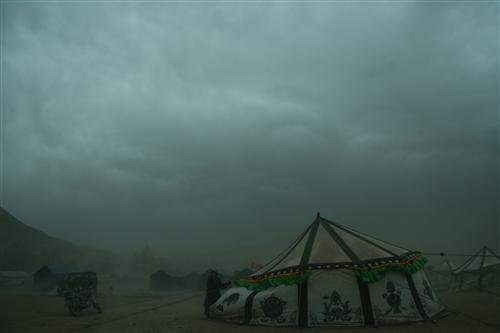 地震發生后,玉樹惡劣天氣頻頻出現,幾乎天天都要出現沙塵暴。記者來到災區后,第一感覺就是這里風沙大,一天要刮幾次大風。風沙吹在的人眼睛都睜不開,災民安置區內天昏地暗,居住的帳篷內床上,吃飯的碗,臉盆里,電腦上都是灰塵。