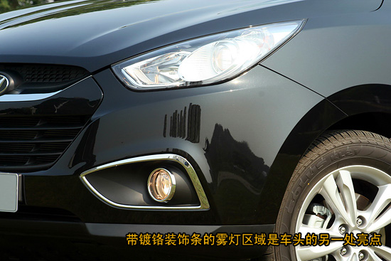 筆者認為ix35車頭另一個亮點之處是霧燈部分。與常規車輛相同,ix35的霧燈也采用了圓形設計,但我所說的亮點當然不是這方面,而是它那與張力十足車頭曲線相輝映的鍍鉻裝飾條。它的外型可以大致歸納成拱形結構,這也讓我想起在之前曾經試駕過的進口奧迪Q5,在設計師的眼中,這種游走在城市間的suv既要給人一種速度的感覺,還要融入力量之美,可以最好詮釋這種理念的無疑是拱形元素。