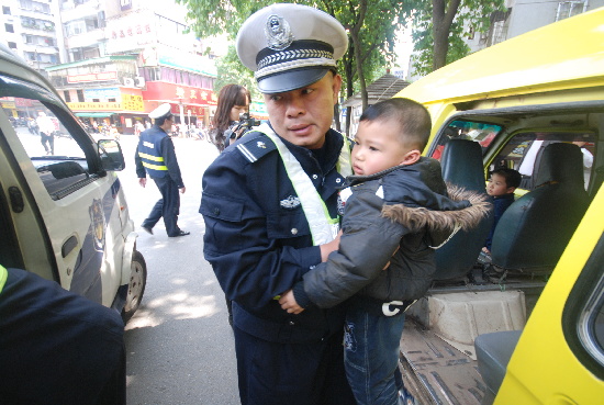 4月27日,蝶山交警大隊的交警對梧州市某幼兒園嚴重超載校車的小朋友進行分流搭乘。
