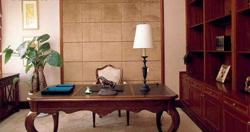 對于視聽室或者書房來說,選擇軟飾墻面和地毯的一個很重要的功能就是吸音,能吸收來自外面的噪音,也能有效地增強室內的混響效果,有利于改善室內的聲音環境。它們能夠幫助營造一個安靜的環境,如果選擇深色調,那么整個氛圍將會變得比較嚴肅。