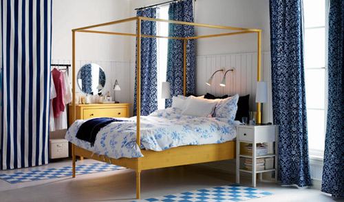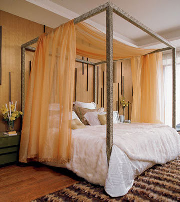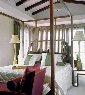 在地板上橫向使用直線圖案地毯,墻上的不規則線條、柱式床具和上面垂掛下來的紗簾也能延展空間,使面積不大的臥室不至于顯得壓抑。